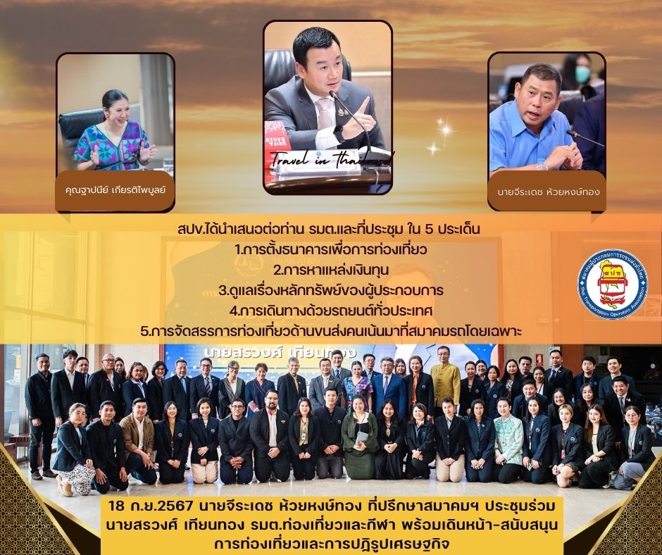 นายจีระเดช ห้วยหงษ์ทอง ที่ปรึกษาสมาคมผู้ประกอบการรถขนส่งทั่วไทย ในฐานะผู้แทนของสมาคมเข้าร่วมประชุมหารือ ณ ห้องประชุมสุพรรณหงส์ อาคารการท่องเที่ยวแห่งประเทศไทย นายสรวงศ์ เทียนทอง รัฐมนตรีว่าการกระทรวงการท่องเที่ยวและกีฬา เป็นประธานการประชุมแลกเปลี่ยนความคิดเห็นกับหน่วยงานภายใต้กระทรวงการท่องเที่ยวและกีฬา นำโดยท่านปลัดกระทรวงการท่องเที่ยวและกีฬา และภาคเอกชน ประกอบด้วย สภาอุตสาหกรรมท่องเที่ยว สมาคมธุรกิจท่องเที่ยว สมาคมโรงแรม ร้านอาหาร ผู้ประกอบการนำเที่ยวและมัคคุเทศก์กว่า 14 สมาคม เพื่อร่วมกันเร่งเพิ่มศักยภาพการท่องเที่ยวโดยการขับเคลื่อนนโยบายของรัฐบาล